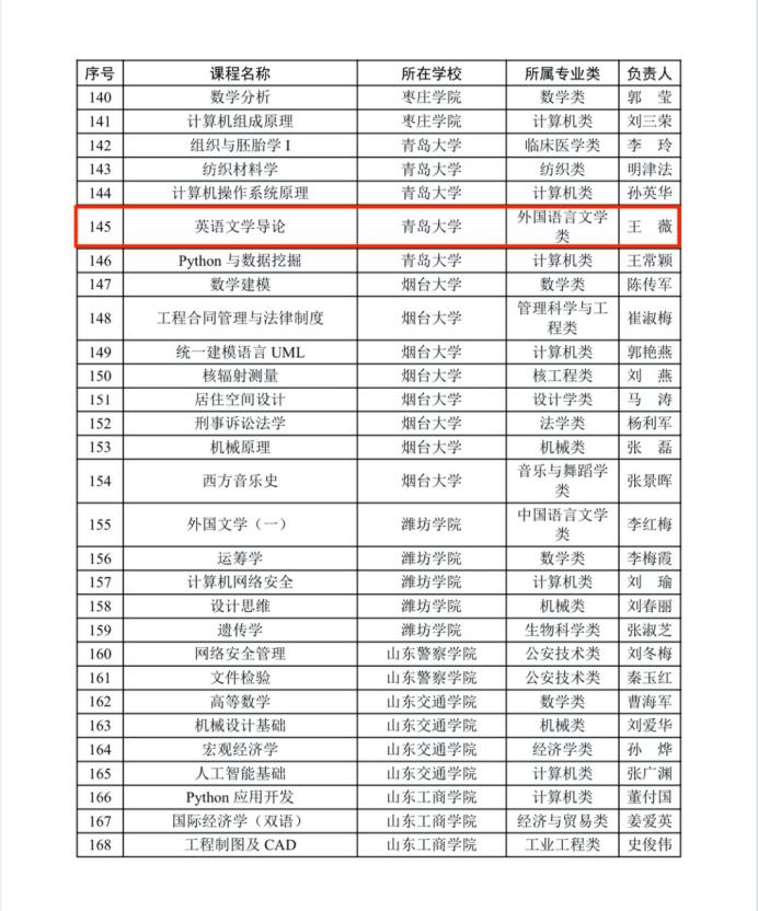 近日,山东省高等教育学会公布了2025年山东省智慧课程拟认定名单,我集团王薇教授担任负责人的《英语文学导论》课程成功获批。此次全省共评选确定200门课程为山东省首批智慧课程,太阳集团官网5门课程获批。
