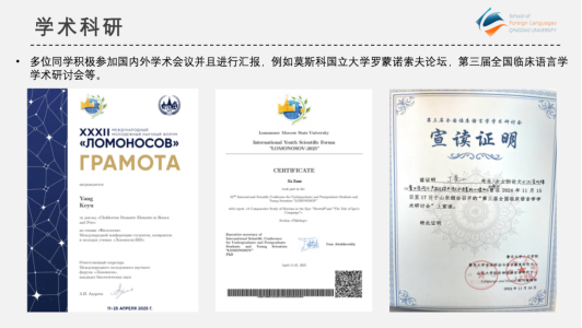 学术科研方面,多位学生积极参加国内外学术会议并且进行汇报,例如莫斯科国立大学罗蒙诺索夫论坛,第三届全国临床语言学学术研讨会等。在优秀毕业论文评选中,1人获得英语系优秀毕业论文;4人获得suncity太阳新城优秀毕业论文;2人的毕业论文推荐参评校级优秀毕业论文。学生的大创相关论文《〈封神演义〉专有名词类型特点及英译方法研究 》入选中国英汉语比较研究会外语学科发展研究专业委员会2023年年会本科生创新论坛并获二等奖;也有学生拥有软件著作权。