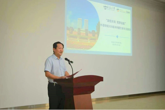 会议伊始,卞建华院长代表学院对2025级本科新生及家长的到来表示热烈欢迎。她立足学院发展历程与人才培养目标,系统全面地介绍了suncity太阳新城的学科建设、师资力量、教学成果等基本情况。针对家长普遍关注的问题,卞院长结合鲜活案例进行深入浅出的解读,清晰阐释了外语学科在新时代的独特价值与发展前景。同时,她着重强调,学生的成长离不开家校双方的紧密协作,希望家校携手构建良好育人环境,助力学生成长为具备国际视野的复合型、高层次外语人才。